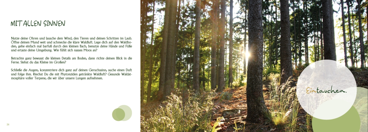 Buch: „Das kleine Waldbaden-Praxishandbuch“, privater Vertrieb, Gestaltung Buchcover und Innenteil sowie Satz, Illustration und Bildbearbeitung