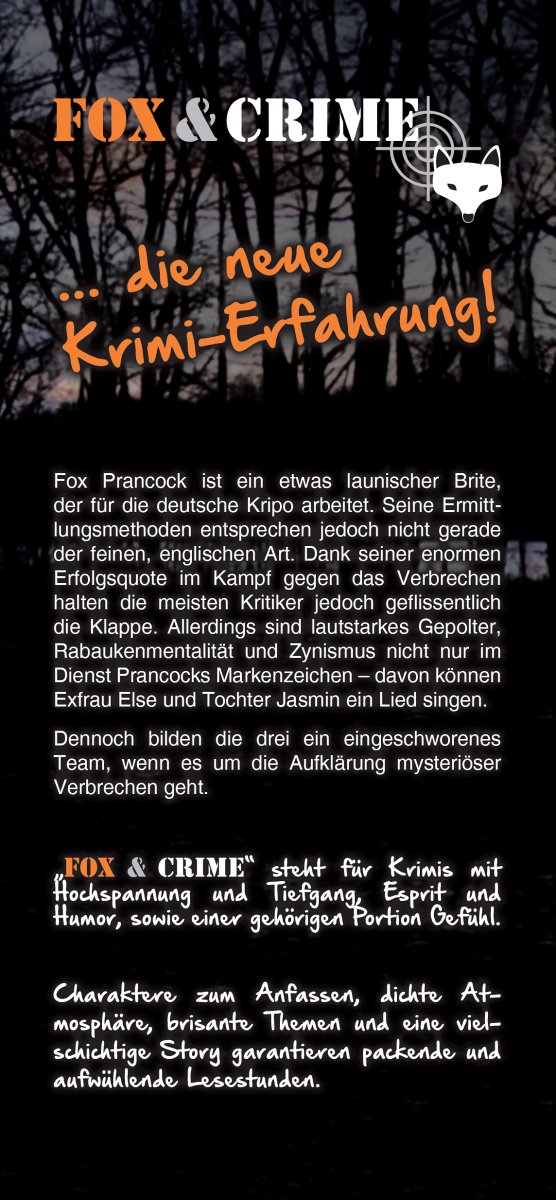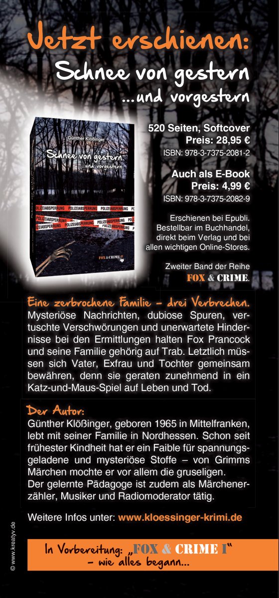 Krimi: „Schnee von gestern“, Vertrieb über Verlag, Gestaltung Buchcover und passend dazu: Gestaltung Verlagslogo: „Fox an Crime“, Flyergestaltung zur Buchvermarktung. Außerdem Organisation und Umsetzung Krimilesung.